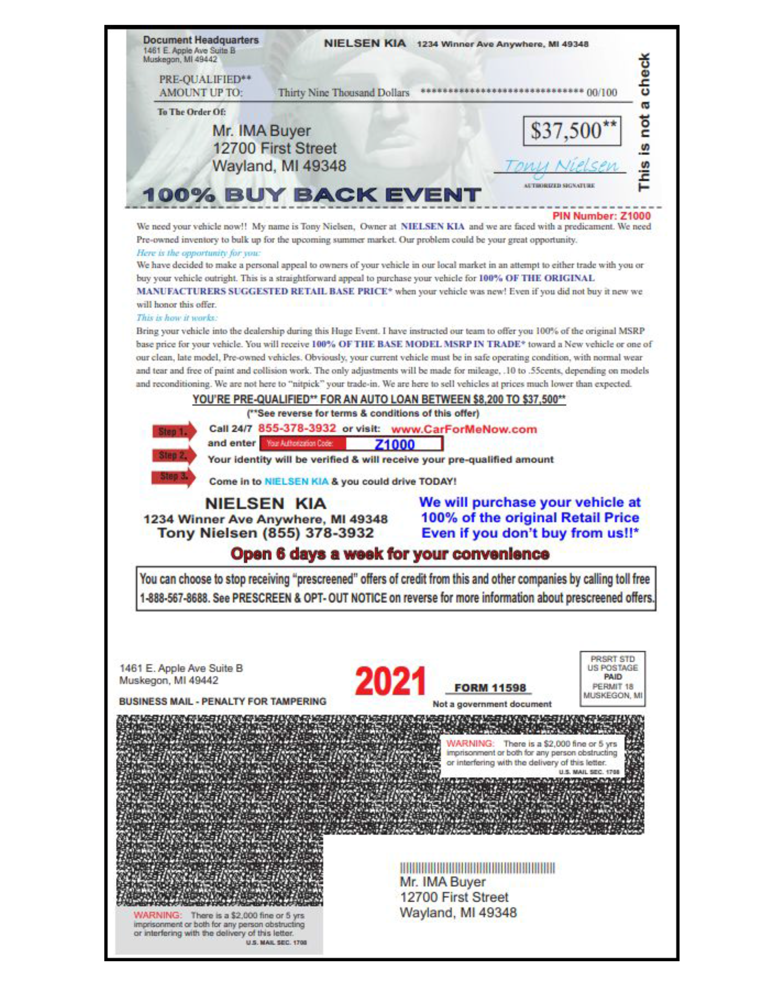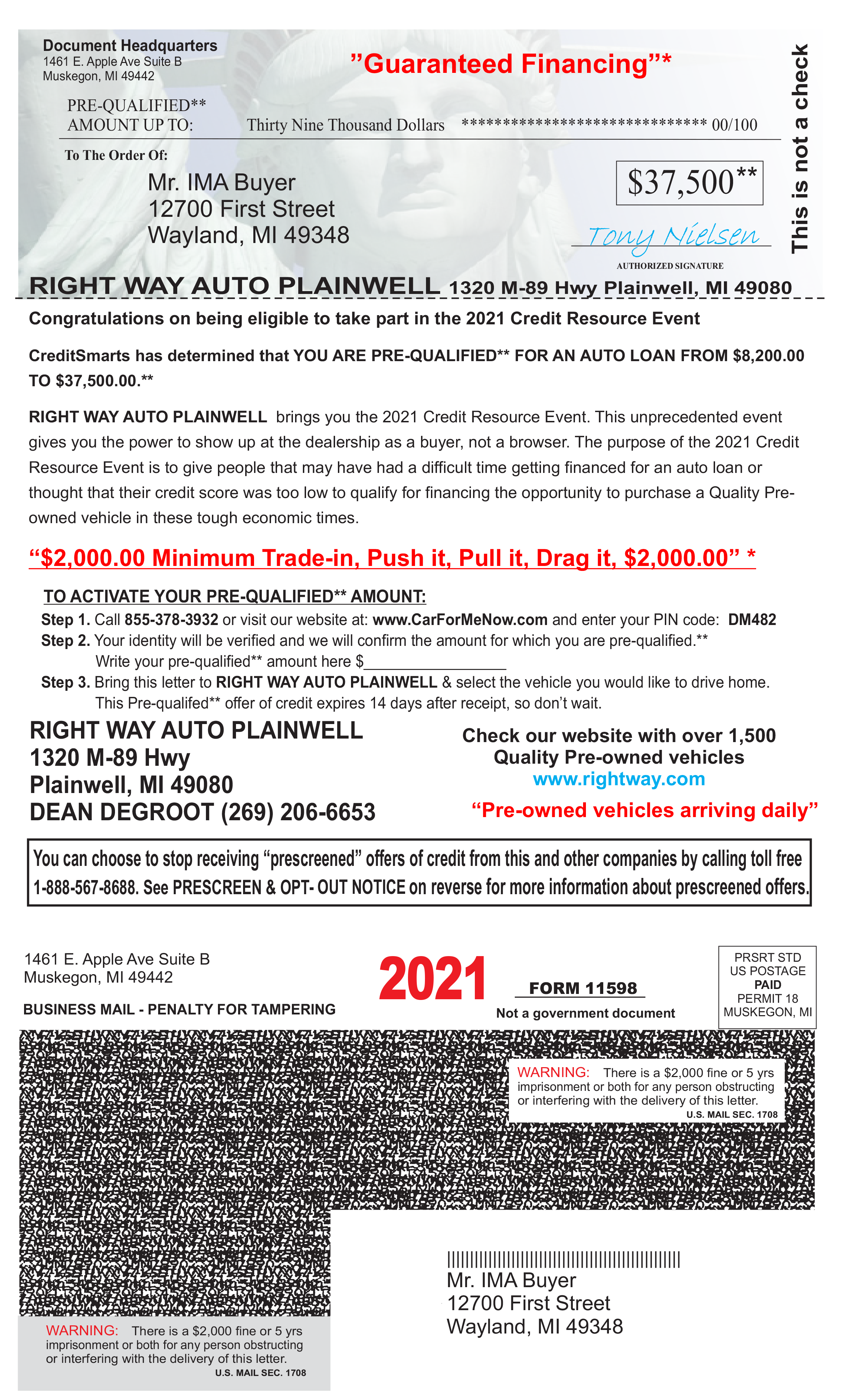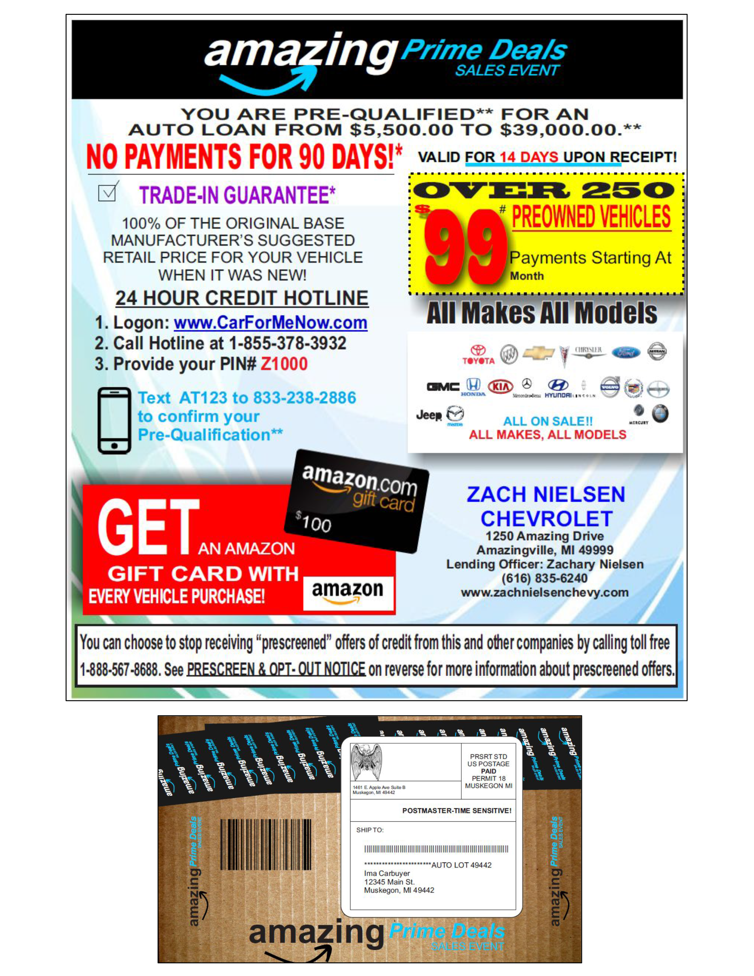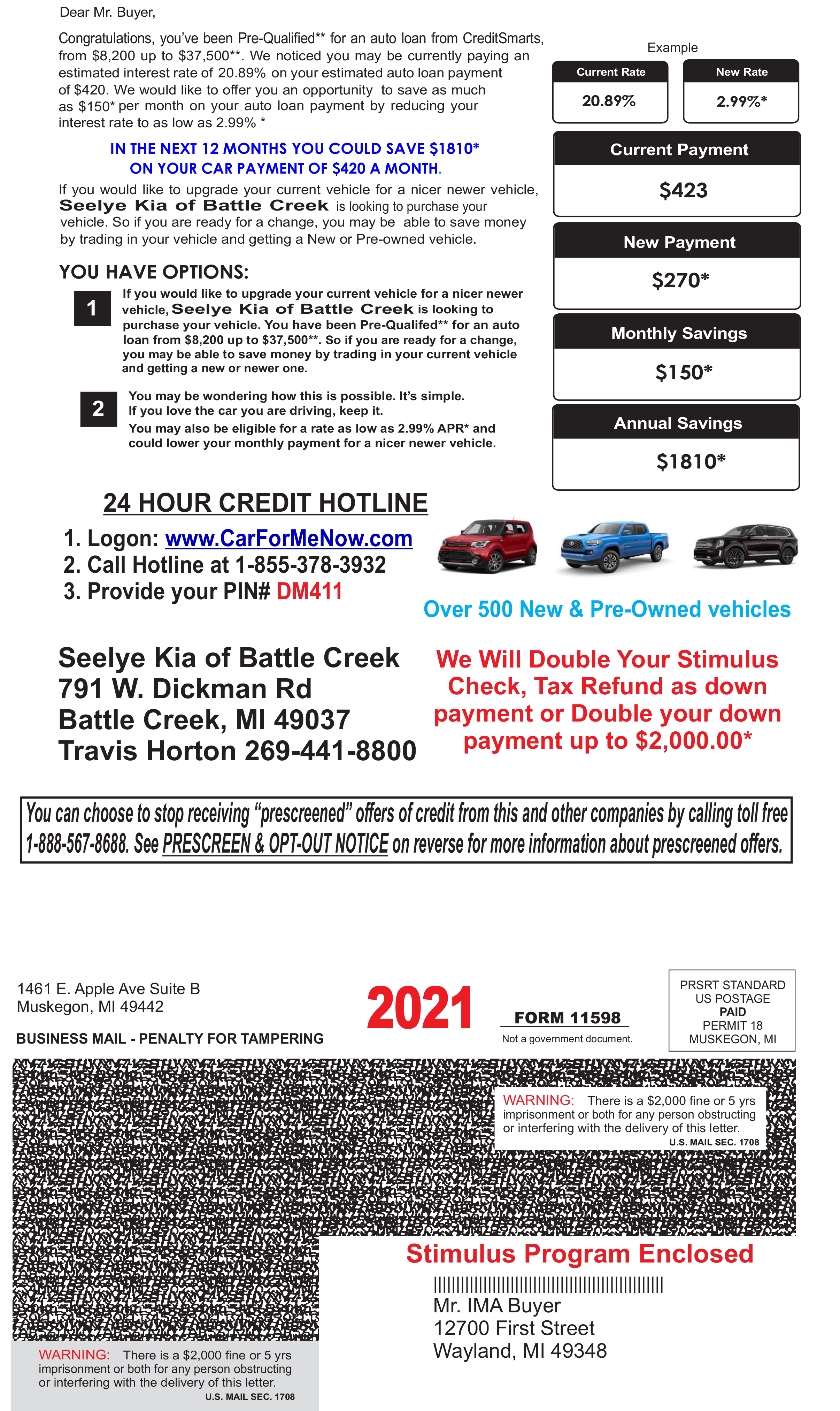 We will design a custom mail pieces to target your needs. With our lists you can target specific customers with offers of a free down payments, low interest or refinance. The mailer invites them to your dealership by letting them know they are pre-qualified for an auto loan and a down payment will be included. We target the credit scores you ask for. Call for a count today in your area today!